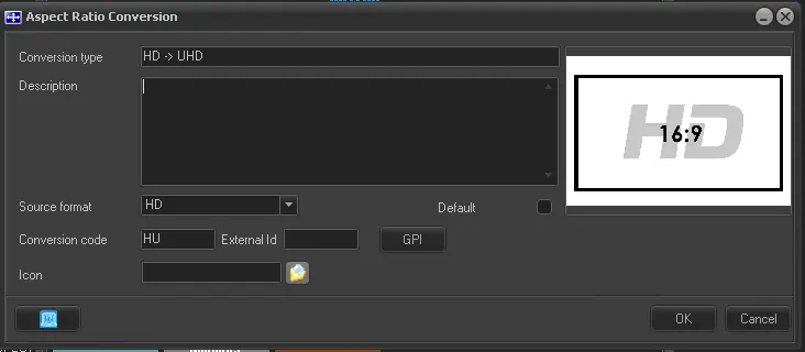 Default - Enable it to set the conversion type (e.g. HD 16:9 -> 4:3 Anamorphic) as the default conversion type for a specific source format (e.g. HD). Default conversion types can also be set by right-clicking on a conversion type and selecting the "set as default" function.