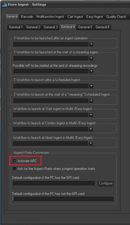 Etere Ingest allows configuring GPI signal combinations to trigger (e.g. on an external device) the ARC profiles that will convert the aspect ratio of a media for previewing ingested assets. This feature can be enabled and configured under the Etere Ingest > Parameters > General 4 section as described in the following instructions: