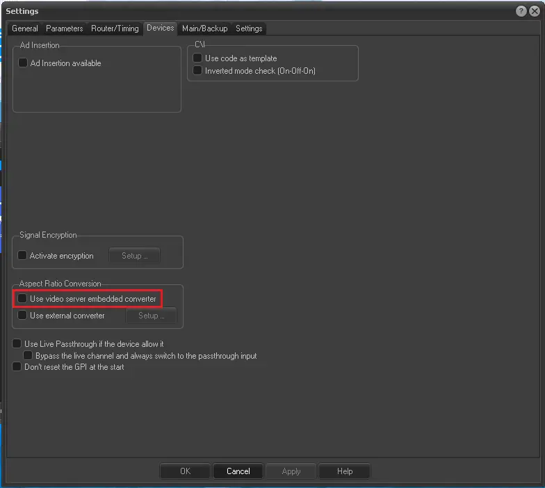 Your video server (e.g. MTX) has an integrated Aspect Ratio Converter. In that case, it is suggested to select the "Embedded ARC" option (rather than the GPI-triggered conversion) to automatically perform required conversions internally.