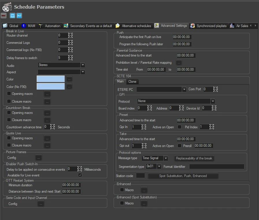 This section allows you to define the settings for commercial break inserted with the SCTE104 insertion standard device, e.g. the "Grass Valley XVP-3901-DPI" digital program inserter. You can define the parameters settings for both Main and Clone servers.