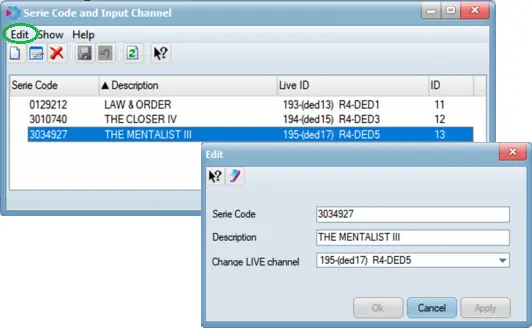 Before importing the program schedule, you can click on the browse button to view and edit the router configuration to associate the season code to the input channel. Add a new channel (e.g., associate the title code and input alias for the Live event), or delete an existing channel. For each station, the input channel configuration can be different.
