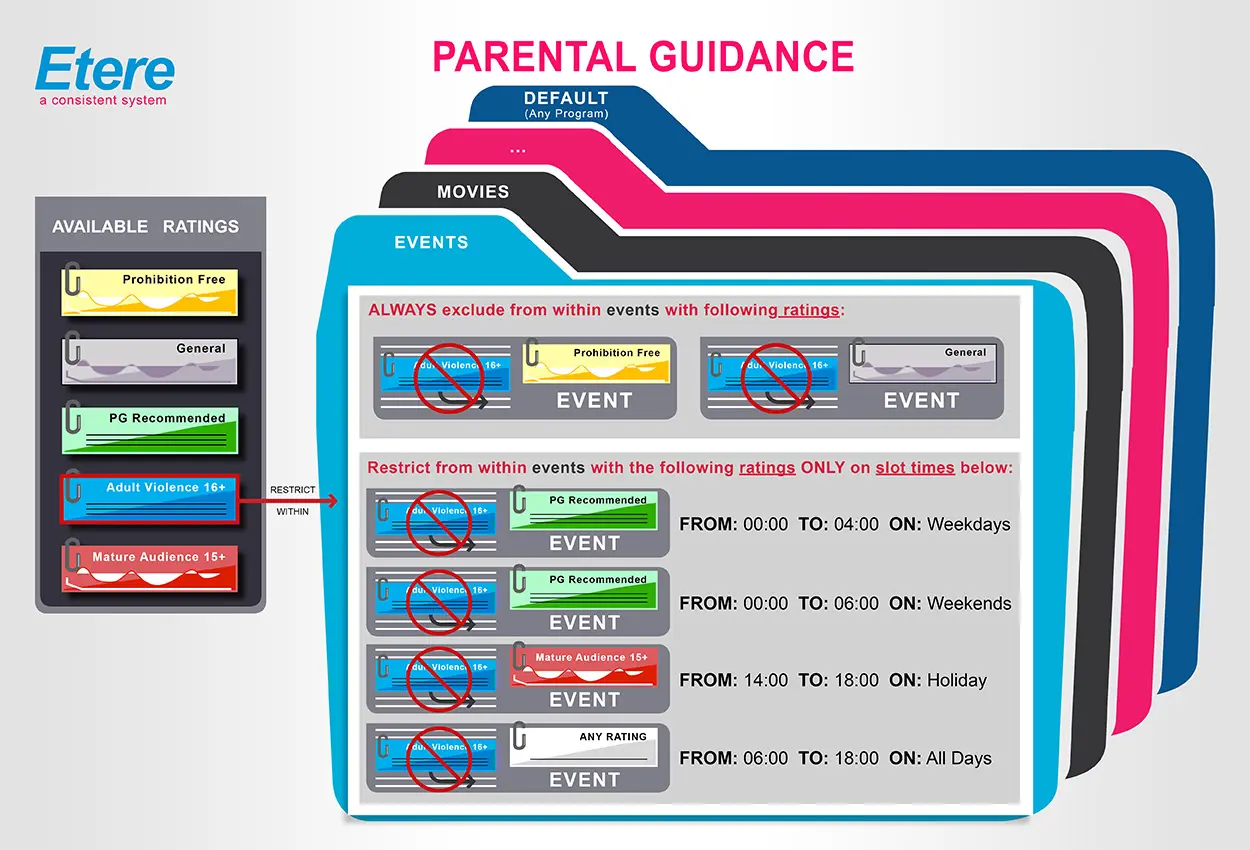 Moreover, you can define a list of parental guidance ratings and the related rules that would define the allowance of scheduling the programs in the broadcast playlist.