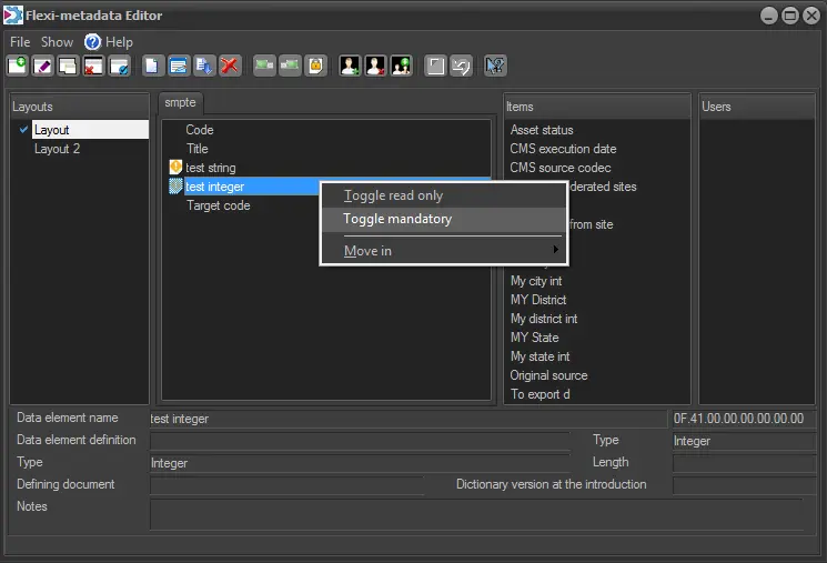 To set a certain Flexi-metadata (e.g. code) as mandatory for a layout, right-click on it and select the "Toggle mandatory" contextual option: