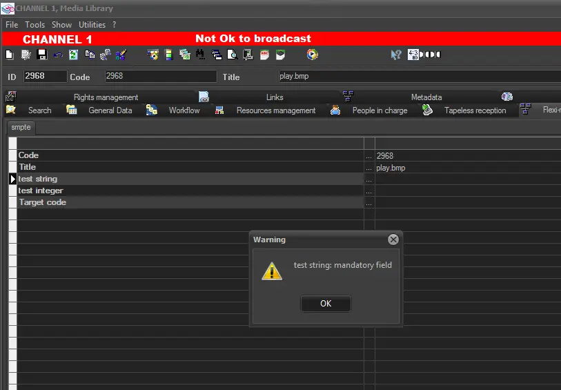 The "mandatory metadata" feature needs to be activated by enabling the "Mandatory fields check" option under the "Etere Conf. > Settings > Media Library > General" section: