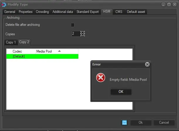 NB: Please note that if an archiving copy (e.g. WMV -> MP_Proxy) is set two times, that is, it's duplicated, a warning message will be displayed to indicate that it will be not possible to save changes without fixing this issue.