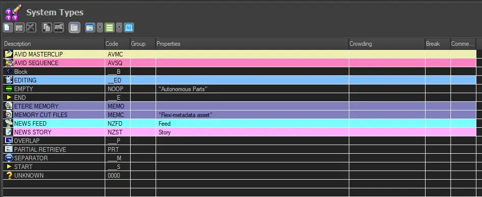 The system types are event types necessary for the correct working of Etere software; without these types, the applications would work incorrectly: