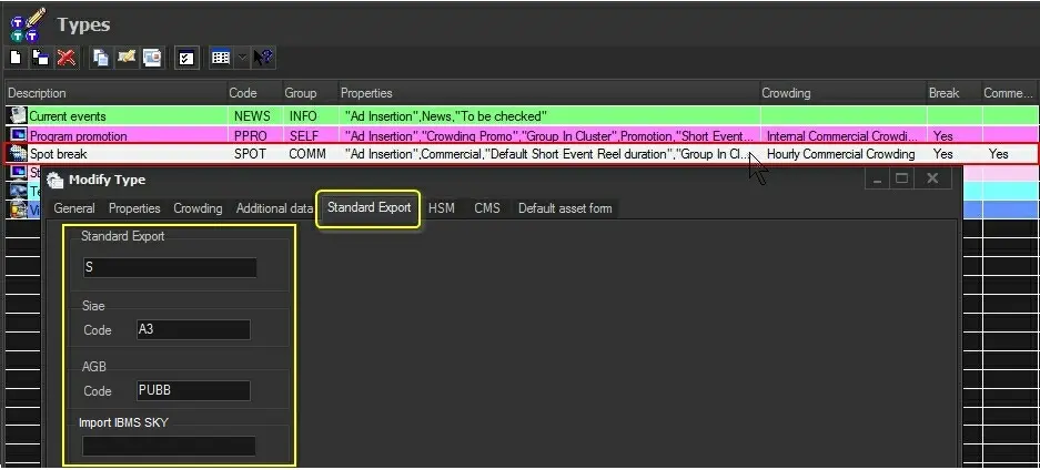 Import IBMS SKY - Enter the Etere type to be used in corresponding to the type imported from Import Standard IBMS SKY CSV