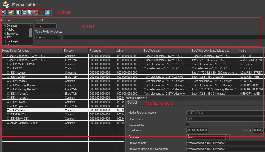 * Media folders are uniquely identified according to the combination of their media folder, IP address and function, therefore, it won't be possible to create more than one media folder featuring a combination (i.e. media folder, IP address and function) already used for another media folder.