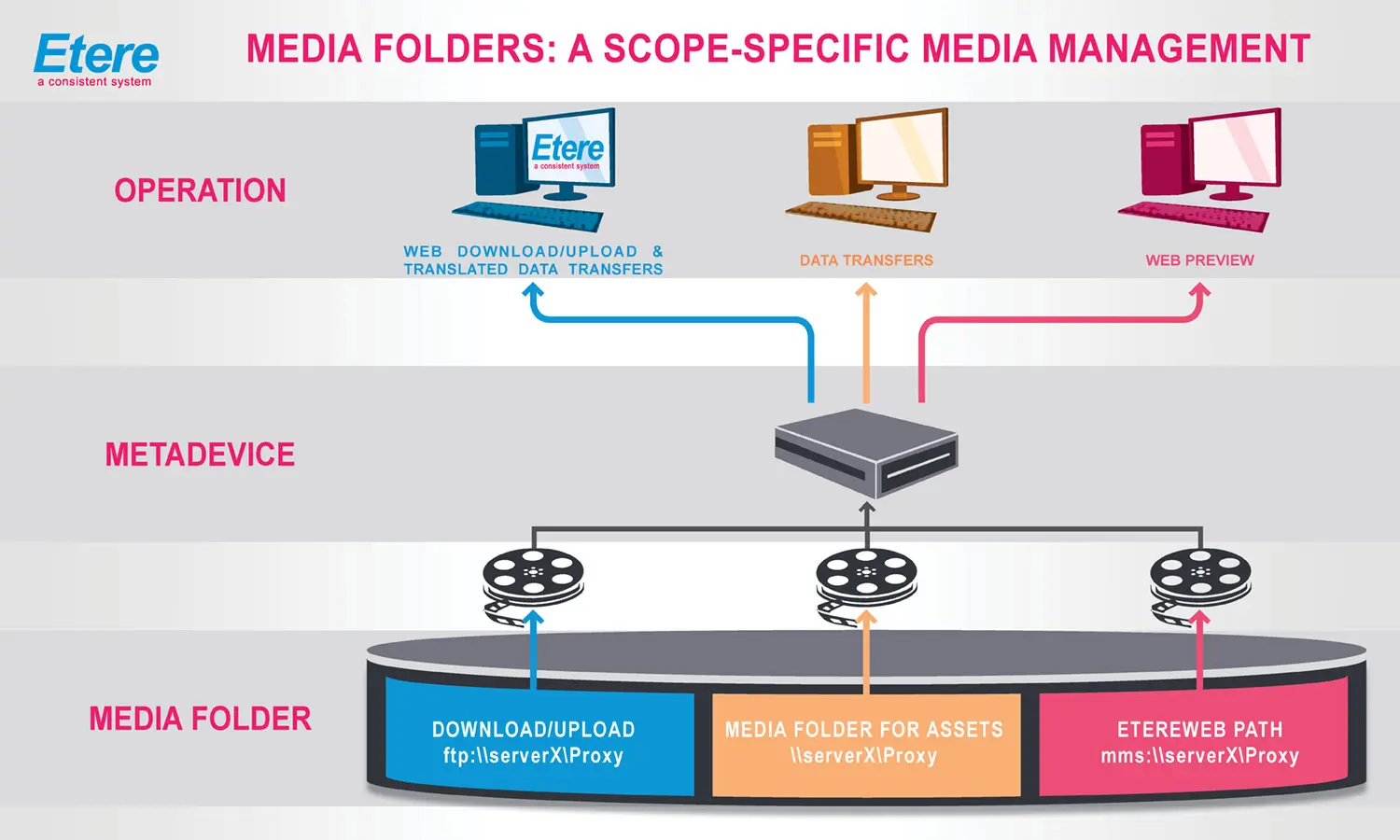 The use of media folders allows Etere to 'translate' media requests regarding a certain metadevice and decide the path to be used for performing said operation.