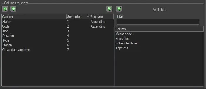 The asset properties visualised in the Ingest List can be either added (->) or removed (<-)from this section. Available properties include:
