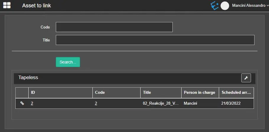 When you log in to EtereWeb and access the "Asset to Link" and “Asset to Send" modules in Tapeless, the selected columns are displayed as defined in the Web Tapeless configuration settings.