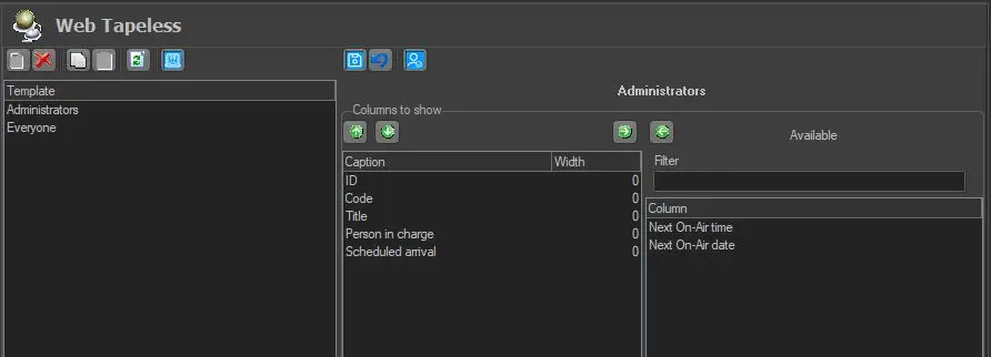 A list of user templates is available for selection on the left panel in the Web Tapeless configuration. When a user template is selected, click on the <New> icon in the Toolbar will display a list of available columns for the selected user template on the right panel under the Available > Column window. For Tapeless Reception, the key columns to be selected include Scheduled arrival, Person in charge, Next On-air date, and Next on-air time.