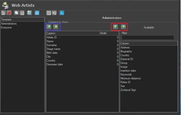 In the Web Artist configuration settings, the list of templates is available in the left panel; once the template is selected, a list of available columns is displayed on the right panel, user can select desired columns to be displayed in EtereWeb by adding or removing them using the green-arrow buttons (outlined in red). Once columns are added to the centre panel (Column to show), position the columns using the green-arrow buttons (outlined in blue).