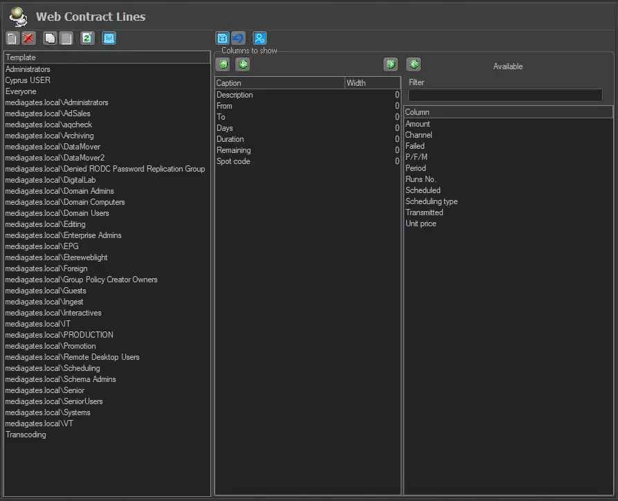 From the right panel, select the desired columns to be displayed (by the users in the selected group) in the EtereWeb's Air Sales Contract Lines by adding them to the central panel using the left-arrow button, or remove them using the right-arrow button.