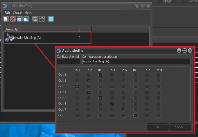 Audio shuffling - If the device used for routing channels supports "audio shuffling", create and modify the profiles for moving audio tracks between outputs. To create a profile, click the [New] button and set its description and routing table: