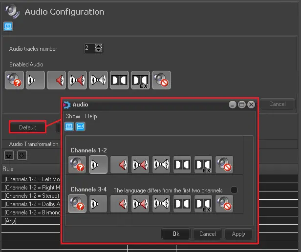 Default - Enable the audio formats to be assigned by default to each pair of channels (e.g. 1-2, 3-4, 5-6, etc):