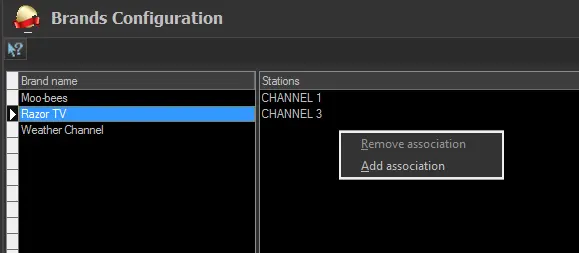 The "Brands Configuration" allows defining the relationships between licensed stations and the brands they represent. Associating multiple stations to one brand is useful to refer to multiple channels (e.g. channel 01 and channel 03) by selecting the related brand (e.g. Razor TV), for example, from Delivery orders.