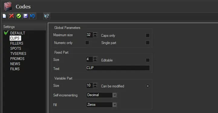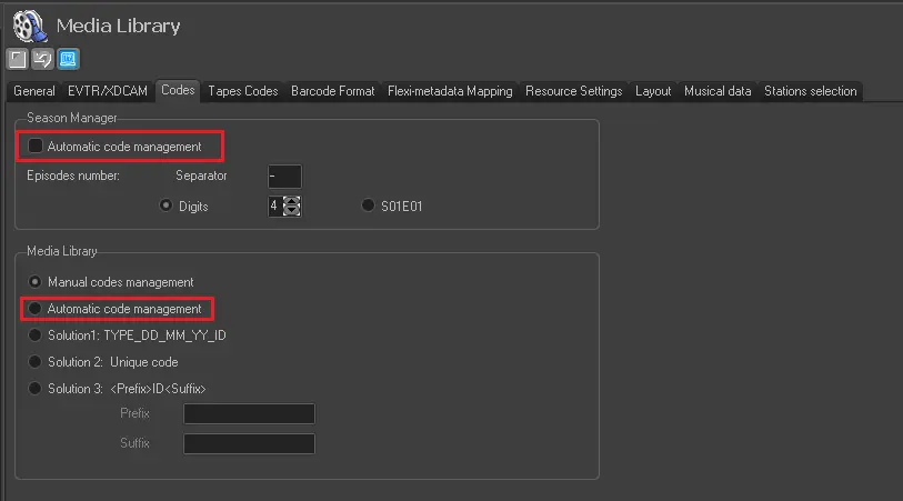 1. First of all, the automatic code generation (based on layouts defined here) needs to be enabled for season assets (managed by the Season Manager) and single assets (managed from the Media Library) under the "Etere Configuration > Settings > Basic > Media Library > Codes" section: