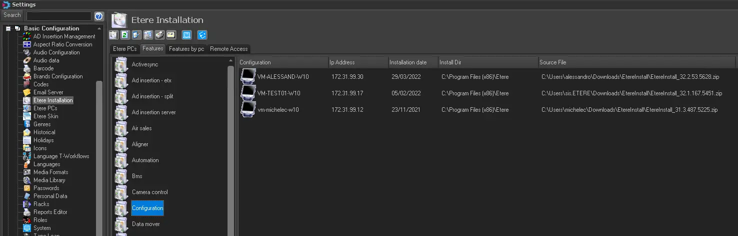Under the Features tab, you can locate the PCs where certain Etere module has been installed at least once (even if it has been uninstalled). Click on a specific feature, and the list of PCs will be shown on the right panel.
