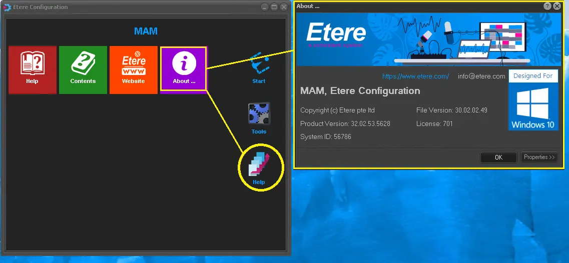In Help menu, click the <About> tile button to view the general information of the Etere PC.