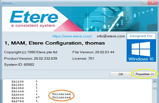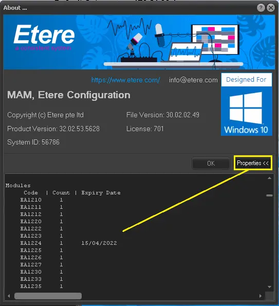 Click the <Properties> button to display all license codes of all Etere modules installed in the Etere PC from the general information page.