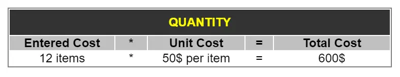 •Quantity: The total cost will be calculated by multiplying the operator's entered cost (e.g. 12 items) by the "unit cost" (e.g. 50$ per item).
