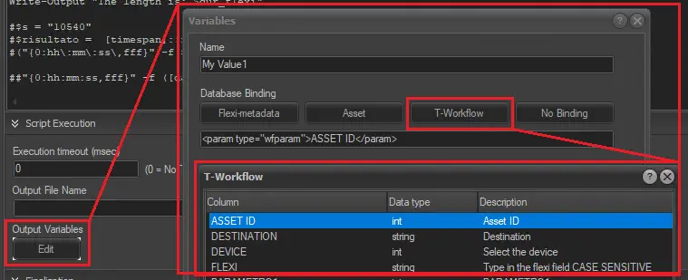 Go to Output Variables in the Powershell action and configure a new binding: enter the name of the Powershell variable, select "T-Workflow" database binding and finally select which parameter you want to write to.