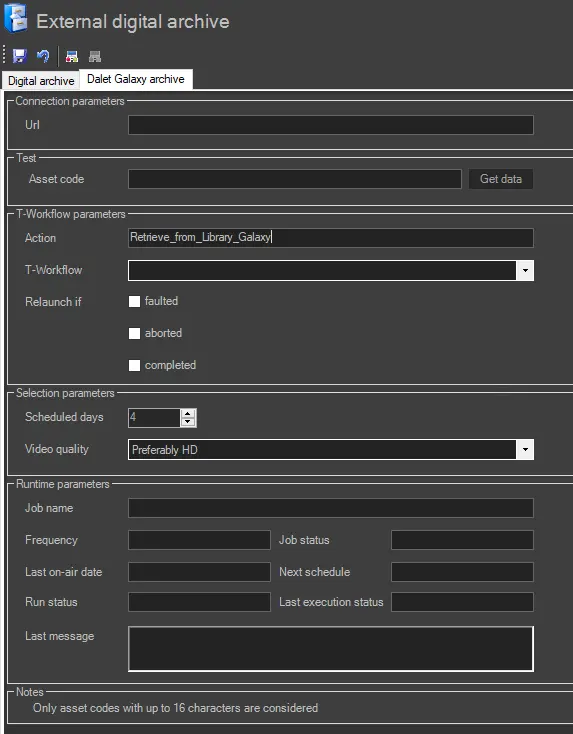 The Dalet Galaxy Archive tab provides an alternative way for Etere to retrieve media contents stored in the digital library via web services. Complete the required T-workflow parameters below to create the T-workflow action.