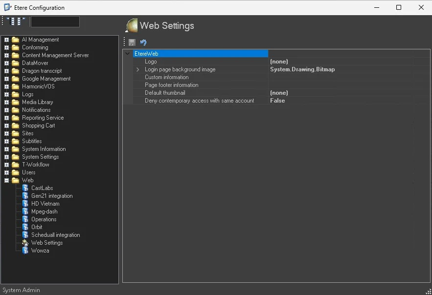 The Web Settings section mainly allows to set some parameters about the customization of the etereweb's login page and interface.