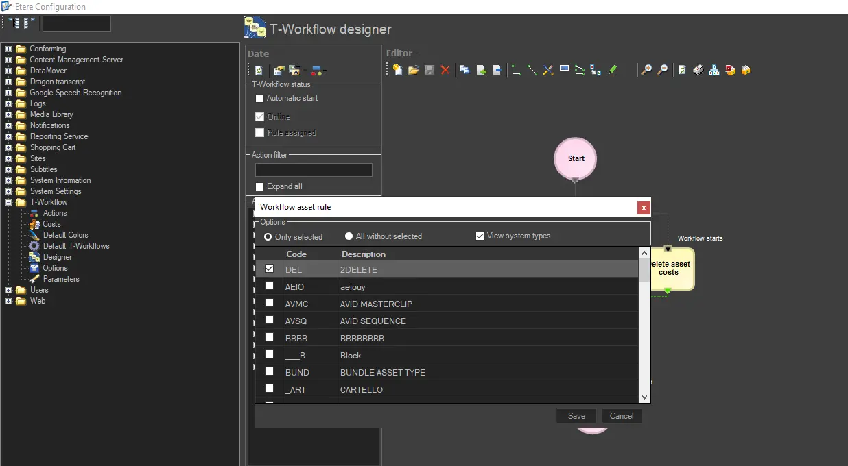 To configure a T-workflow to run exclusively with pre-determined assets, the user should go to 'Etere Configuration > Configuration Editor > T-Workflow Designer', open the desired T-workflow and click on the 'Manage workflow asset rules' option, which is meant for linking a T-workflow to specified asset types: