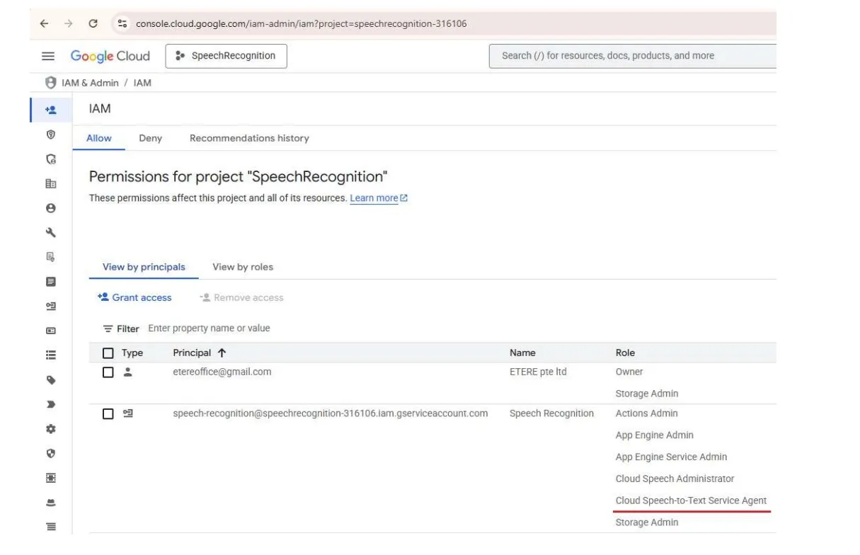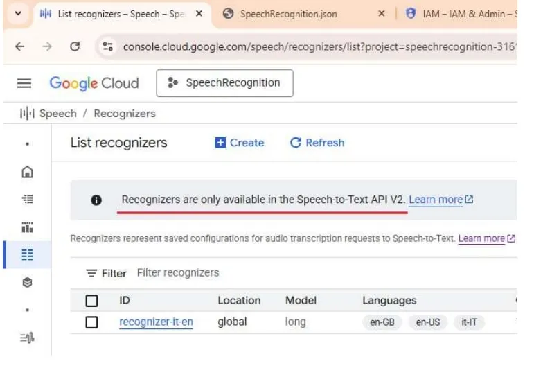 1) Speech-to-Text API V2 configuration is required. In the google account you must create a recognizer (List_recognizer)