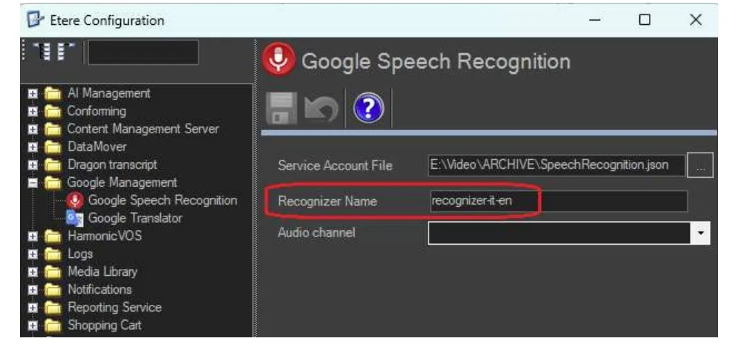 3) In the Etere Configuration you can set the Recognizer Name