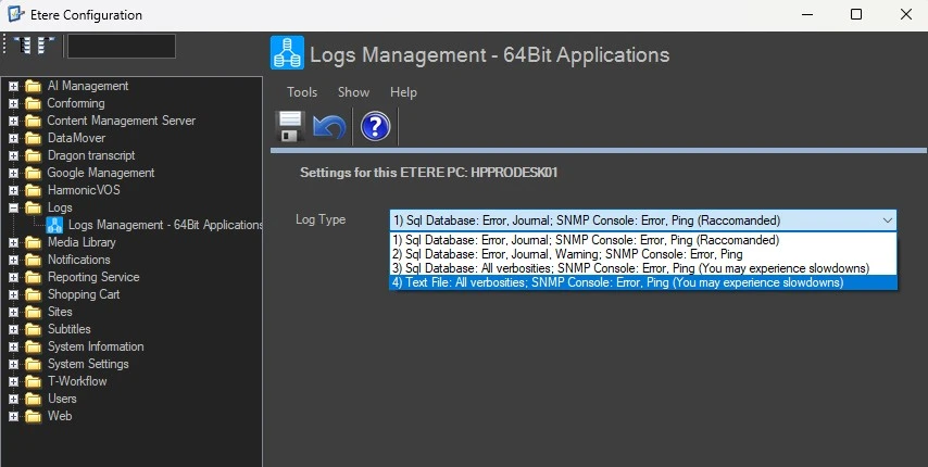 • Log Type 2 = Log to SQL database, include all verbosities information (Log Type 0 + 1). (This setting could result in system slowness)