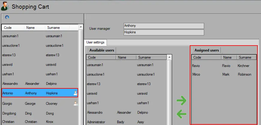 2. Select a user (e.g. Flavio Kirchner) from the "Available users" in the central panel and press the -> right button to move it to the "Assigned users" in the right panel; it would assign the user as selected supervisor. Repeat these steps to assign more users to the supervisor's group.
