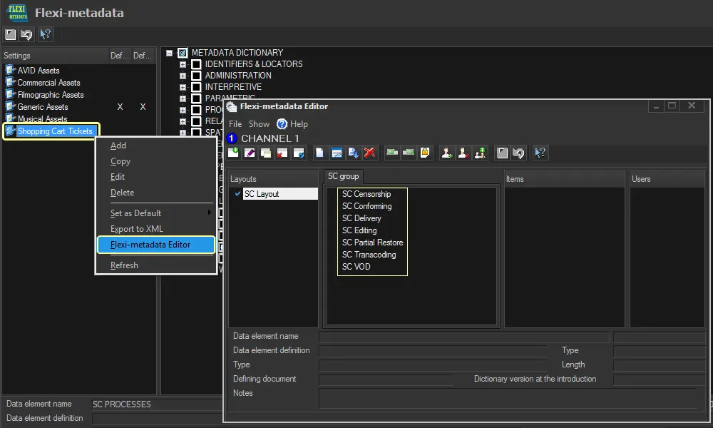 In "Etere Configuration > Settings > Media Asset Management > Flexi-metadata", under the "Experimental Metadata > Local" node, create a new node (e.g. SC Processes) and add all processes to be used in the Shopping Cart (e.g. SC Transcoding, SC Delibery, SC VOD, etc.) to the node.