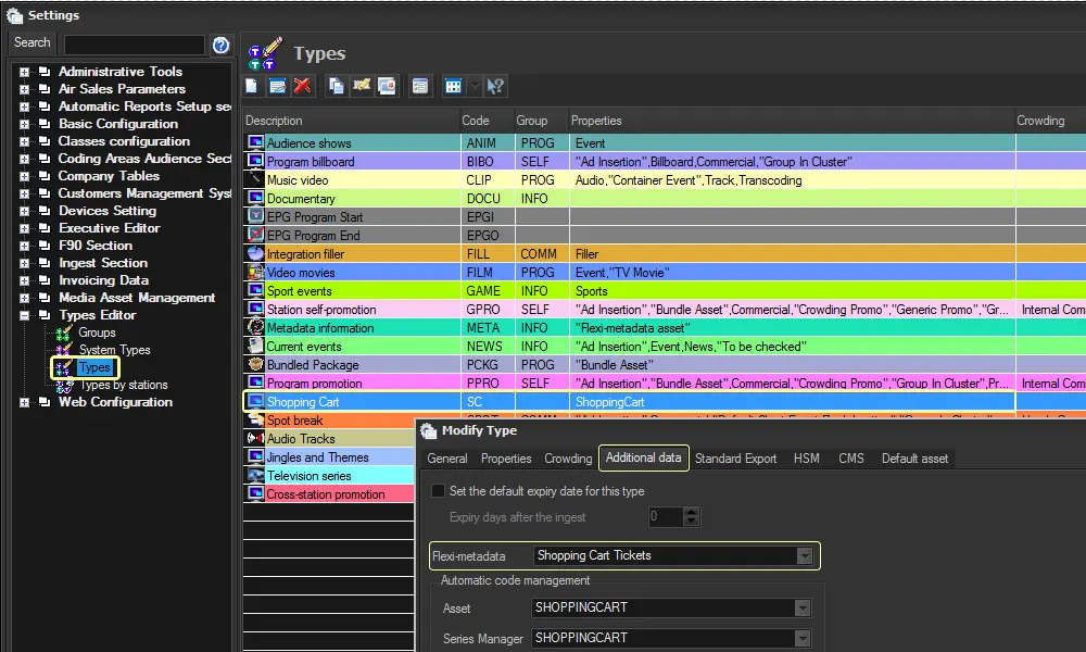 In "Etere Configuration > Settings > Types Editor > Types", create a new type (e.g. Shopping Cart), and enable the "shopping cart" property under the "Properties" tab: