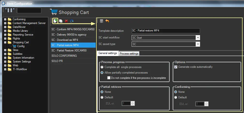 Note: The conforming and partial restore pre-processes are performed using the related workflows set in "Etere Configuration > Conf. Editor > T-Workflow > Default T-workflows". For more info on Processing modes, click here.