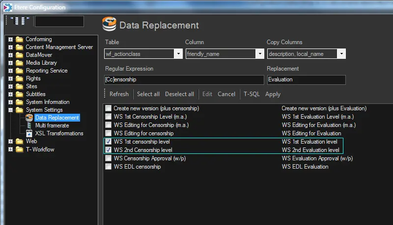The "Data Replacement" section allows administrators to easily replace the value of any table field matching a regular expression. Data replacement can be easily performed by following the procedure below: