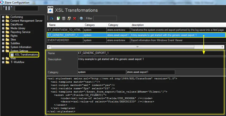 The XSL Transformations section allows the creation of custom XSLT schemas to be subsequently used to export and import from and into the Etere database: