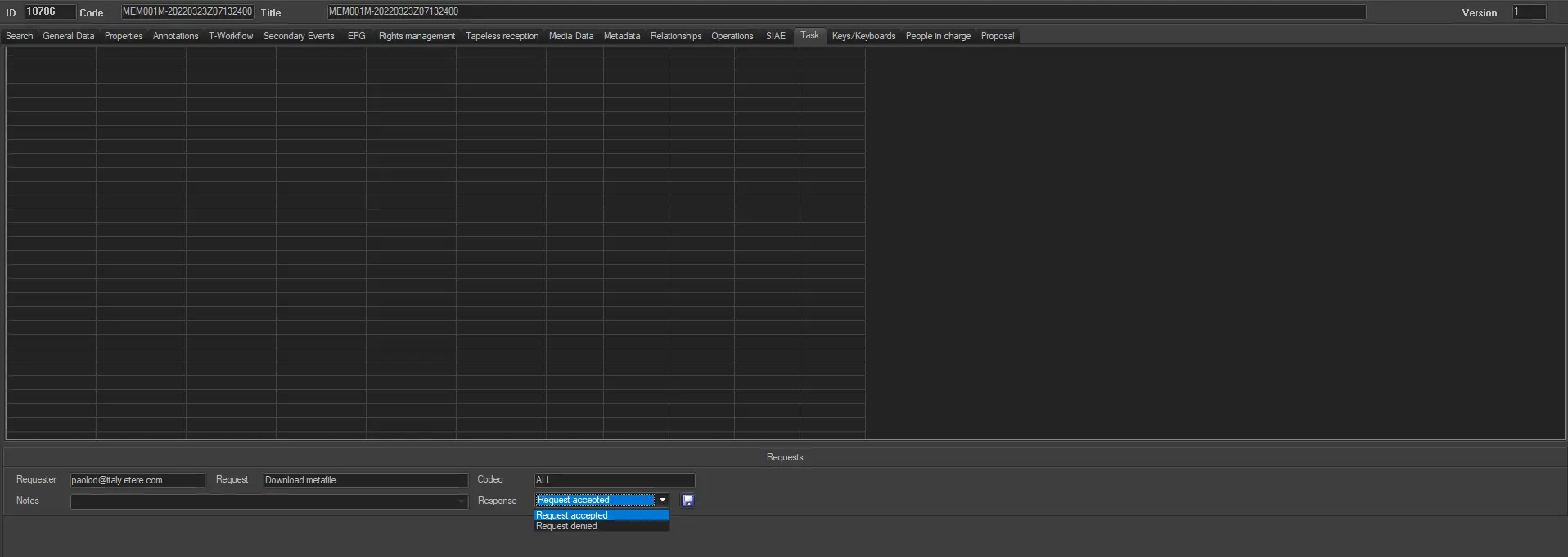 NB: Please note that currently, Etere manages a unique "web request" action; therefore, each time a new "web request" action is created and saved, it will replace/overwrite the already existing action (and remove the replaced action from all T-workflows on which it was present).