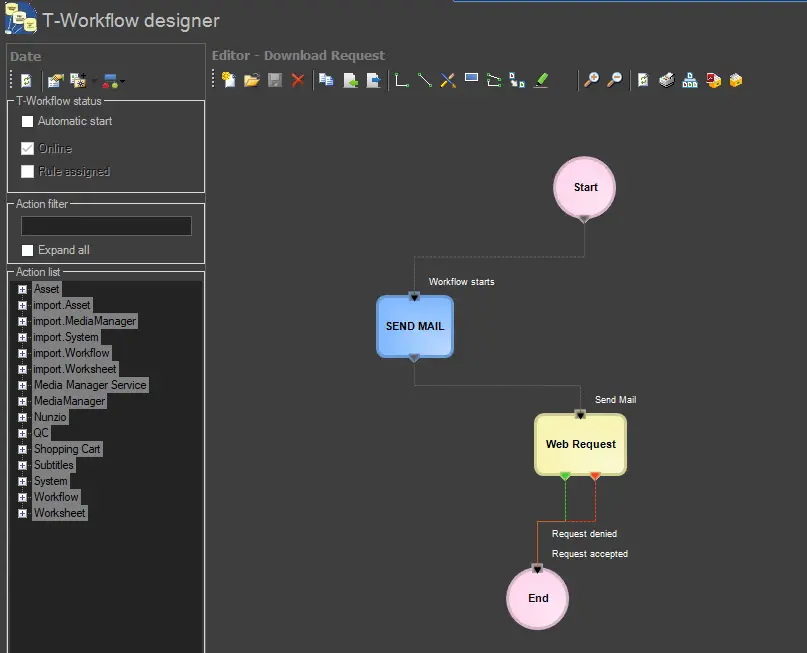A web request action allows handling requests received via T-workflow from web users who ask for temporary permission to perform a particular task (e.g. download a file linked to a specific asset).