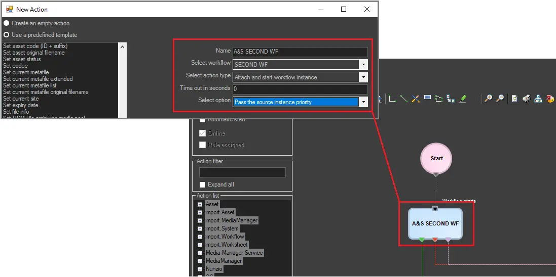 Attach workflow instance - The selected T-workflow will be associated with the asset, but it won't be started; the action will return output based on its result: attached / not attached