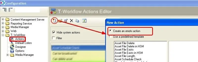 The action properties form also shows the parameters for some actions, including conforming, T-workflow, worksheets, etc.