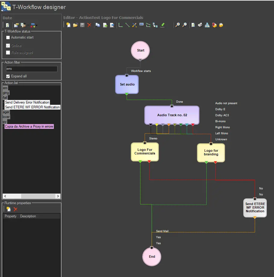 Once created, the "Logo" action can be included in a T-workflow to be subsequently attached to the asset for which the logos will be set, for example, depending on their audio track format: