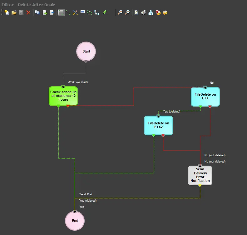 Once a 'FileDelete' action is created, it requires to be inserted into a T-workflow to be attached to assets; this T-workflow can be, for example, a T-workflow for deleting all media files related to assets present in some playout servers (e.g. MTX1, OMNEON1 and MTX1) and which are not scheduled to send on-air shortly (e.g. next 24 hours):