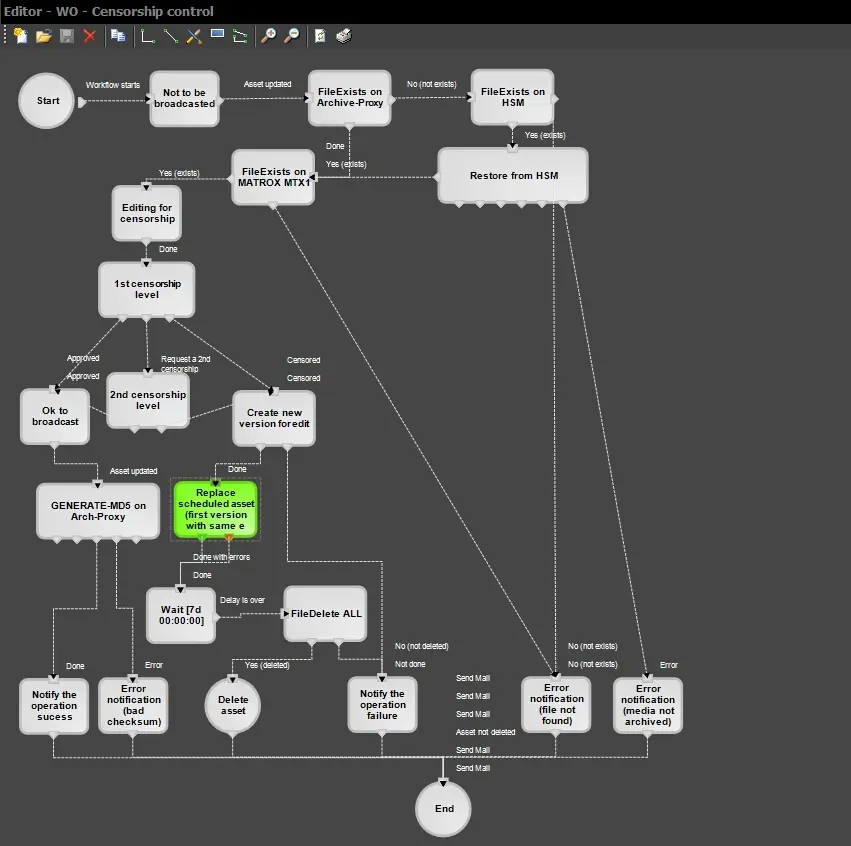 The "Replace scheduled event" actions can be included in T-workflow -under the T-Workflow designer- to, for example, automatically and quickly replace an asset with its new version (edited and approved after censorship):