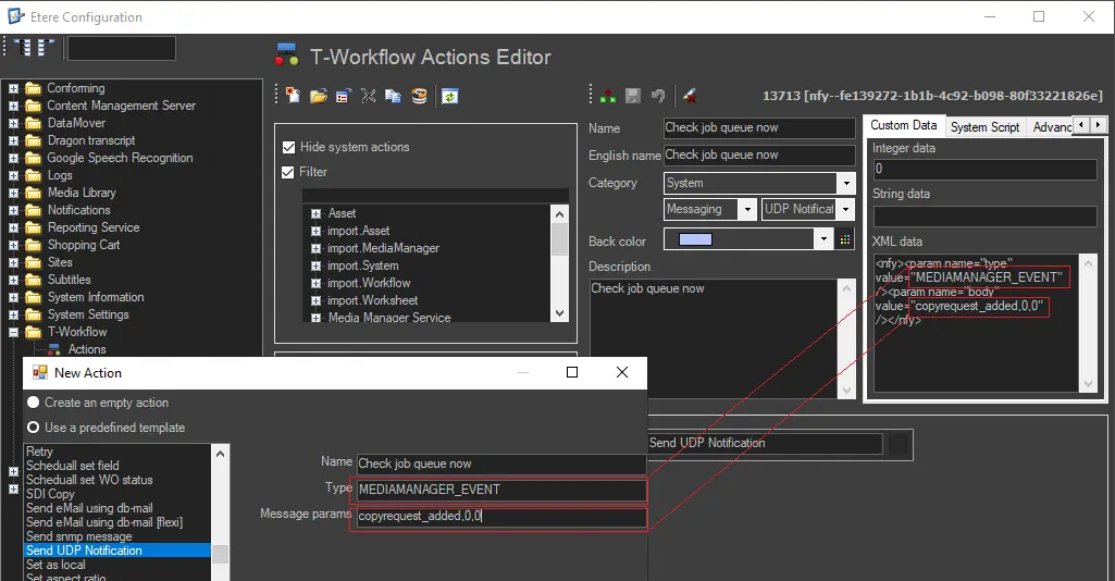 This action can be used (in the T-Workflow designer) to, for example, make Etere Data Mover send a UDP notification during media transfer every 5 minutes to check the job queue.