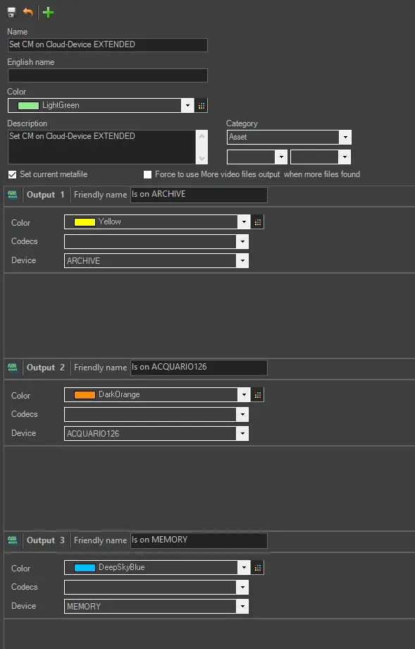 •If there are two or more metafiles that match the criteria for the same output, enable the option "Force to use more video files output when more files found" to fulfil the action.