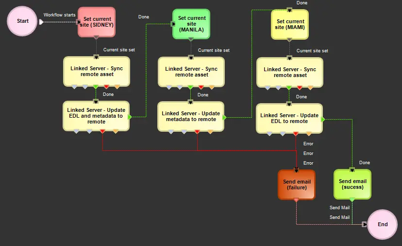 The "Set current site" action allows to set the reference site (e.g. an Etere system located at Sidney) of a T-workflow instance, this information will allow performing operations (e.g. Remote Workflow Action (linked server) specifically in that site.