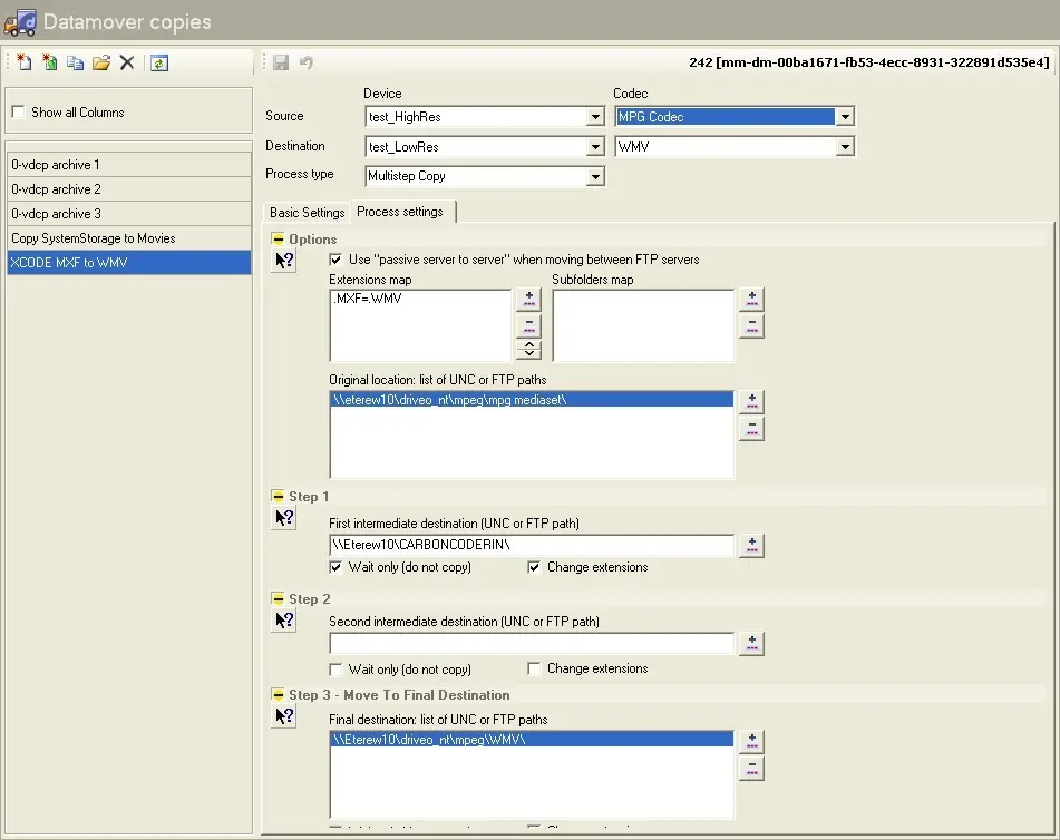 •Specify Step1: a first intermediate destination where the file should be copied into. This field refers to the Carbon Coder Watch folder previously specified. Make sure that the 'wait only (do not copy)' parameter is disabled (Etere Data Mover will wait for the file to appear) as well as the 'change extension' parameter, which should also be disabled (Etere Data Mover will wait for a file with the same name but with a different extension).